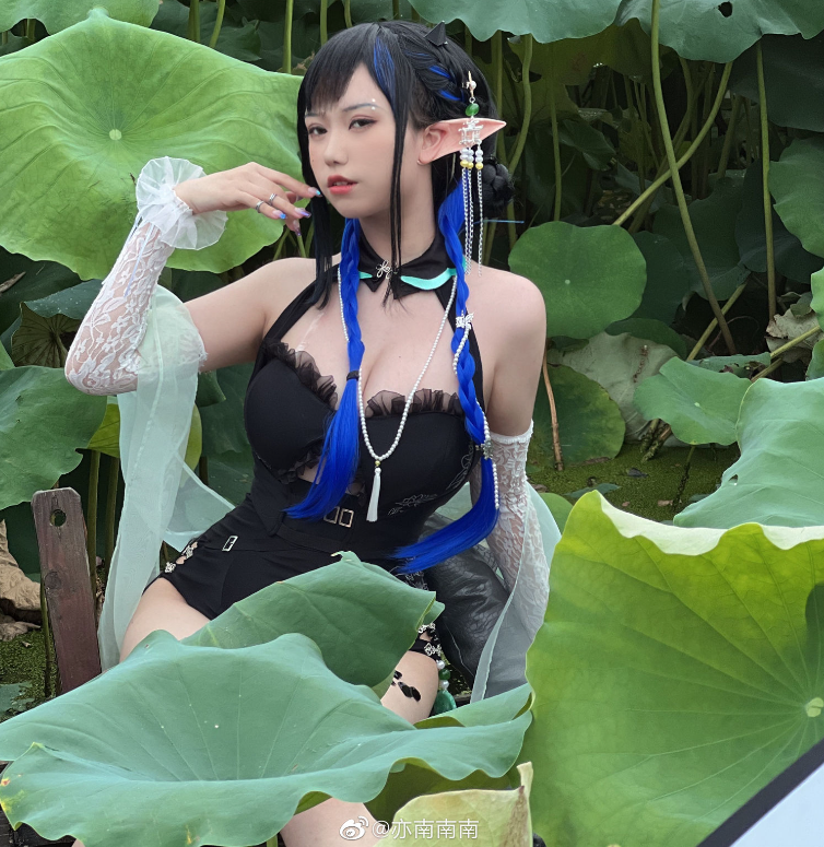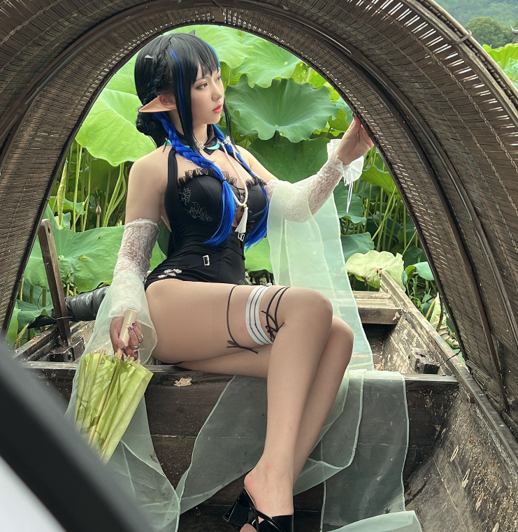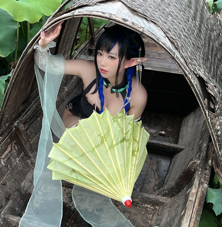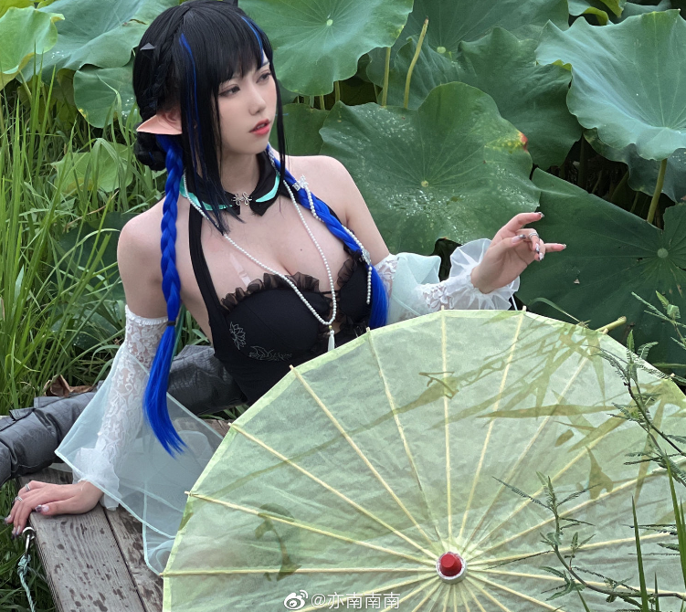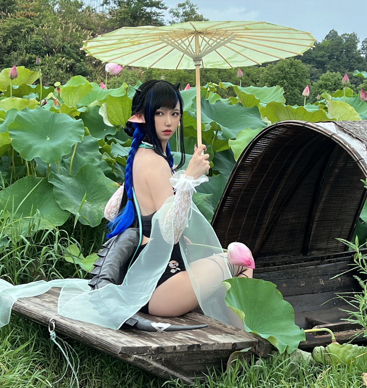 画面中,亦南南南手持一柄浅绿油纸伞,悠然坐于船首,四周荷叶翩翩,洋溢着盛夏的清新韵味。她身着白色薄纱衣袖,其上荷叶图案点缀,既清新又高雅。当她侧首望向镜头,那份淡然却让人难以移开目光。蓝色的发丝被编织成双麻花辫,与黑色皮质绑带相得益彰,完美融合了仙气与酷感。肩头的微翘犄角,更添一抹奇幻色彩,仿佛引领我们步入一个梦幻的童话世界。