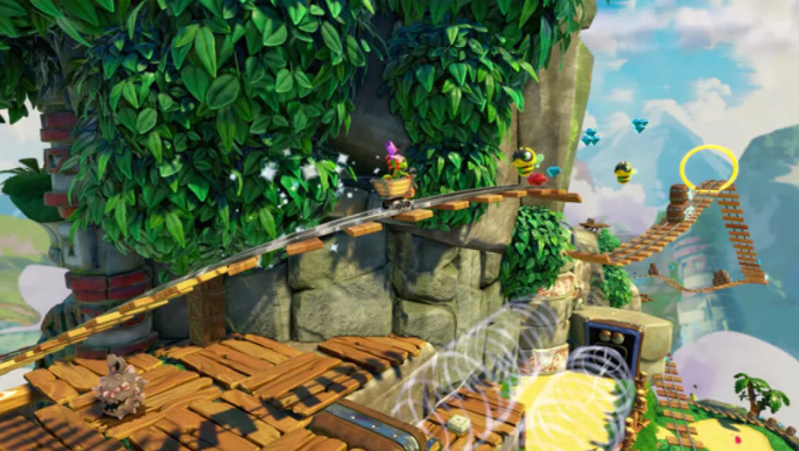 相较于前作《尤卡莱莉大冒险》,《回归》并非简单复刻,而是进行了全方位的精炼升级。最显著的提升在于画面表现力。游戏世界色彩更为饱满明快,场景细节更加丰富生动,流畅运行的60帧画面让每一次蹦跳、翻滚和滑翔都丝般顺滑,极大地提升了动作的流畅感与视觉愉悦度。操控响应也经过了细致调校,角色动作衔接更加自然,空中转向和落地判定也更加精准可靠,显著降低了因操作延迟带来的挫败感,使玩家能更专注于探索与挑战本身。